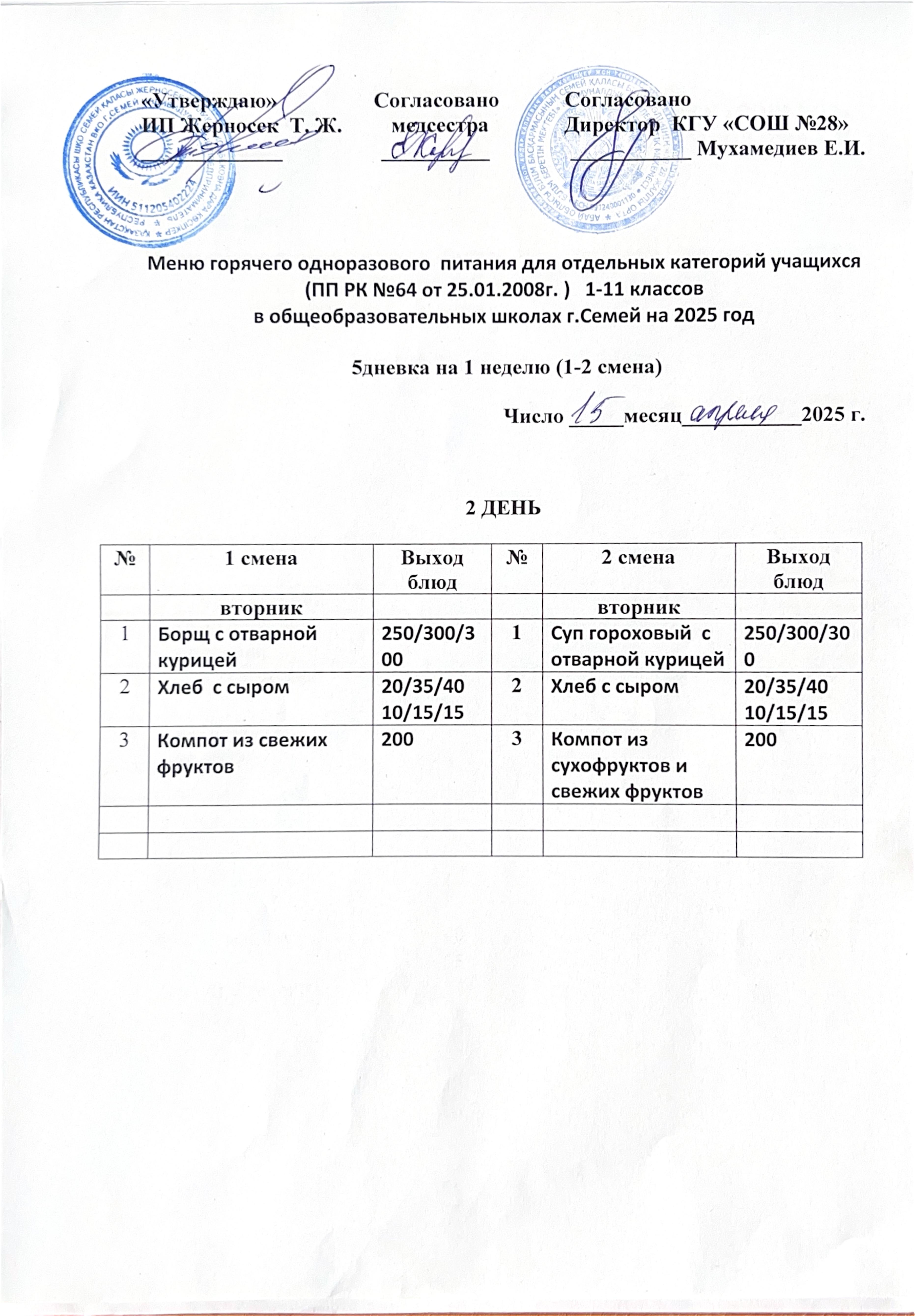 Меню столовой КГУ "СОШ № 28" на 15 апреля 2025 года (1, 2 смены